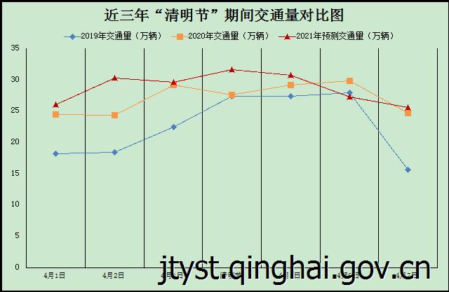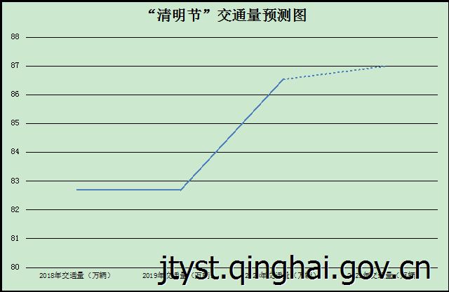 根据历史数据分析,预计2021年“清明节”小长假我省总体交通量较去年同期略有上升,约为88万辆。其中,高速公路实行小型客车免费通行政策,交通量较前后时段增加5%,4月3日交通量约为28万辆,4月4日清明节当日达到小峰值,约为30万辆,4月5日约为29万辆,4月5日下午通往西宁周边道路交通量可能出现高峰,4月6日交通量将小幅回落。“清明节”期间主要以踏青游、返乡祭祖出行为主,西宁通往周边县城及乡村旅游景点的交通量将会增加,道路通行的自然灾害类突发事件也将会小幅增加。