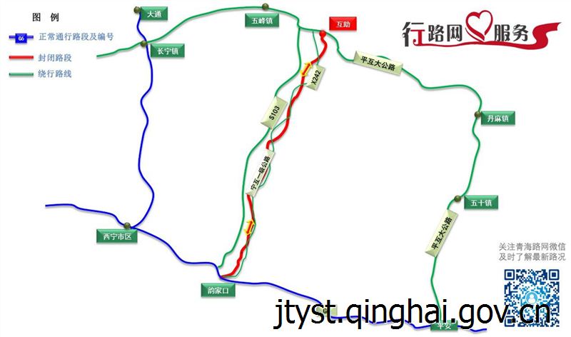 绕行路线:往返西宁至互助的车辆可由平互大公路、省道103、县道242行驶。