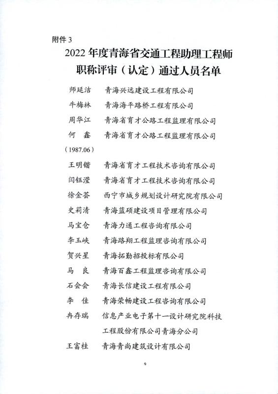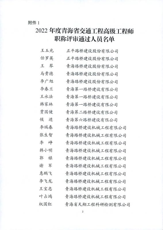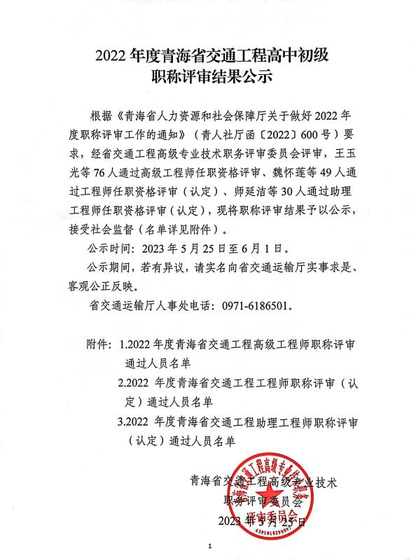 2022年度青海省交通工程高中初级职称评审结果公示