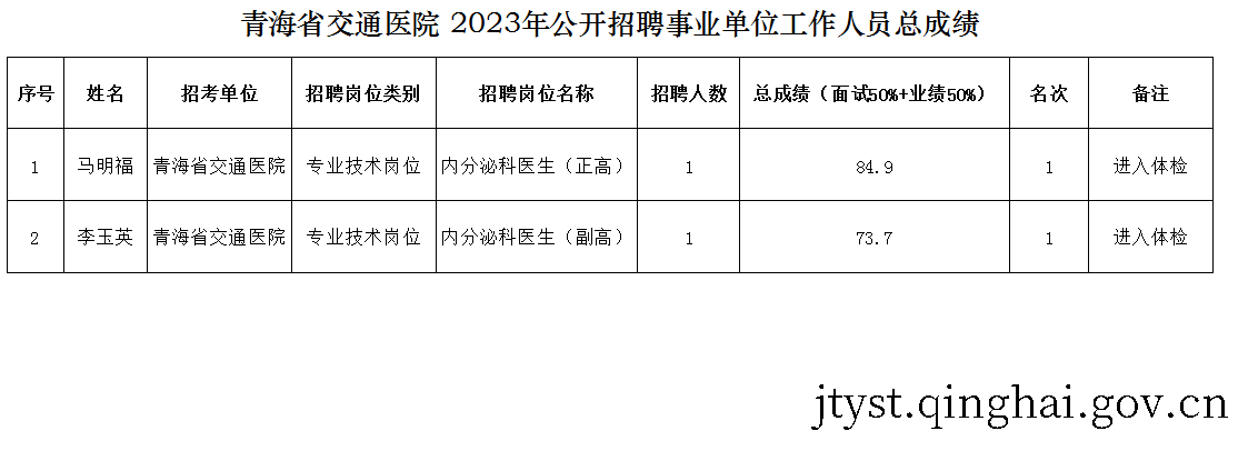 根据青海省交通医院2023年公开招聘事业单位工作人员公告有关规定,现将青海省交通医院 2023年公开招聘事业单位工作人员总成绩及进入体检人员名单予以公示,公示期为12月14日至12月20日(7天),并就体检、政审相关事项通知如下:
