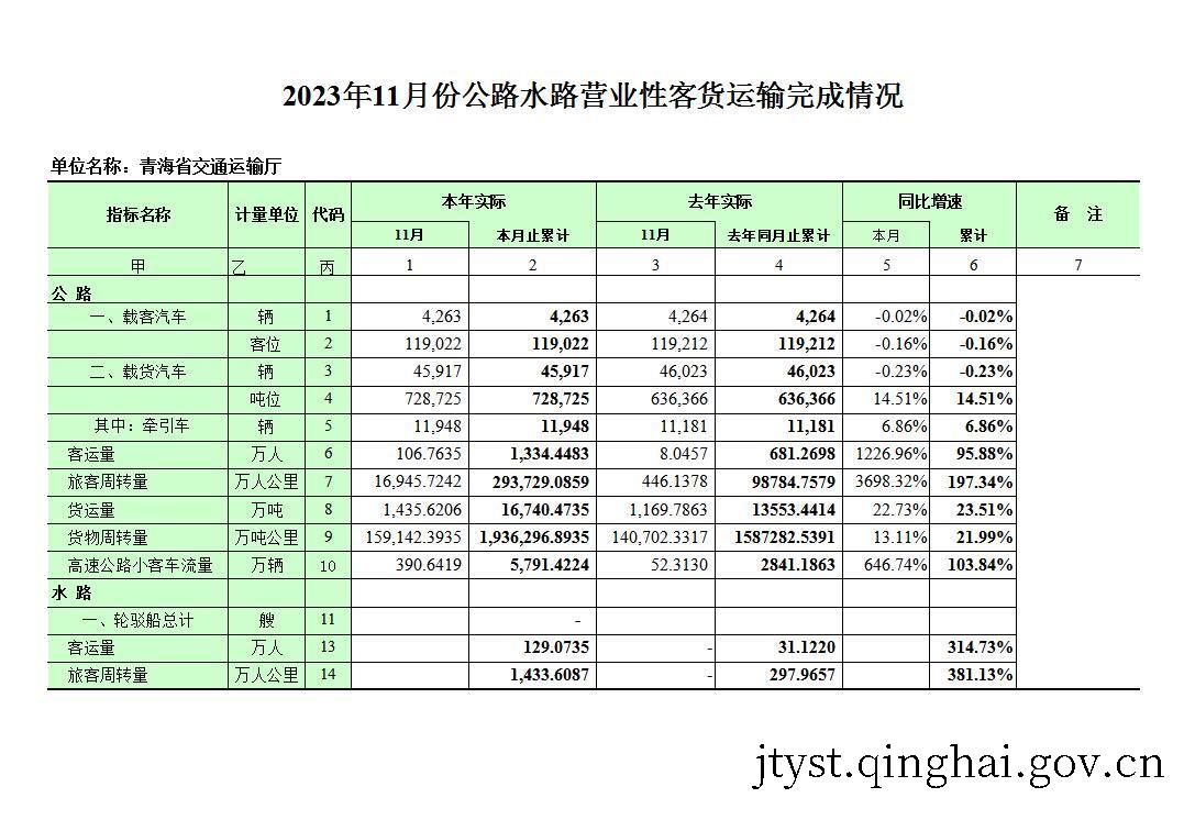 2023年11月份公路水路营业性客货运输完成情况