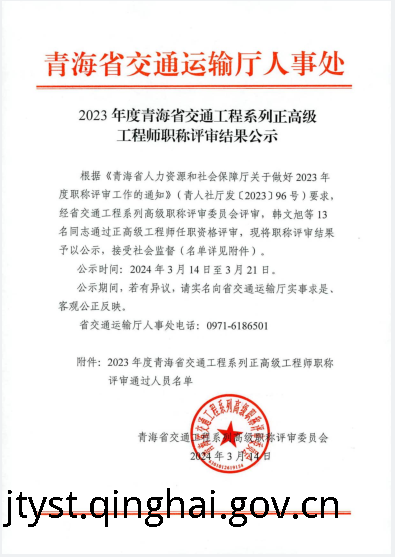 2023年度青海省交通工程系列正高级工程师职称评审结果公示